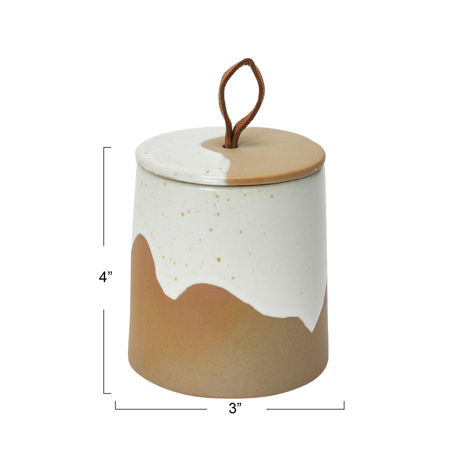 Catalog Name: 3-3/4" Round x 3-3/4"H Stoneware Canister w/ Lid & Leather Loop, Reactive Glaze, Cream Color Speckled & Brown (Each One Will Vary)