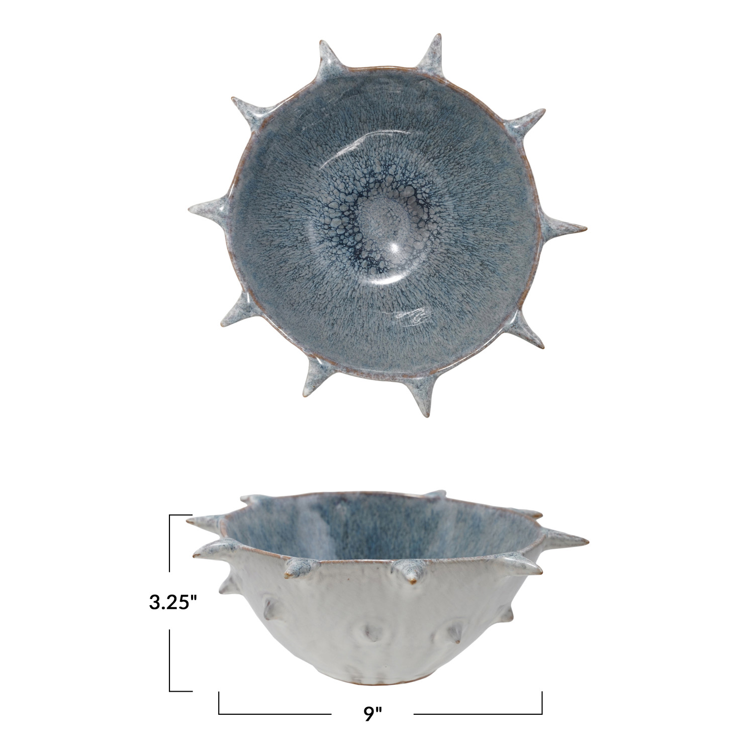 Catalog Name: 9" Round x 3-1/4"H Stoneware Urchin Shaped Bowl w/ Spikes, Reactive Glaze, Blue & White (Each One Will Vary)
