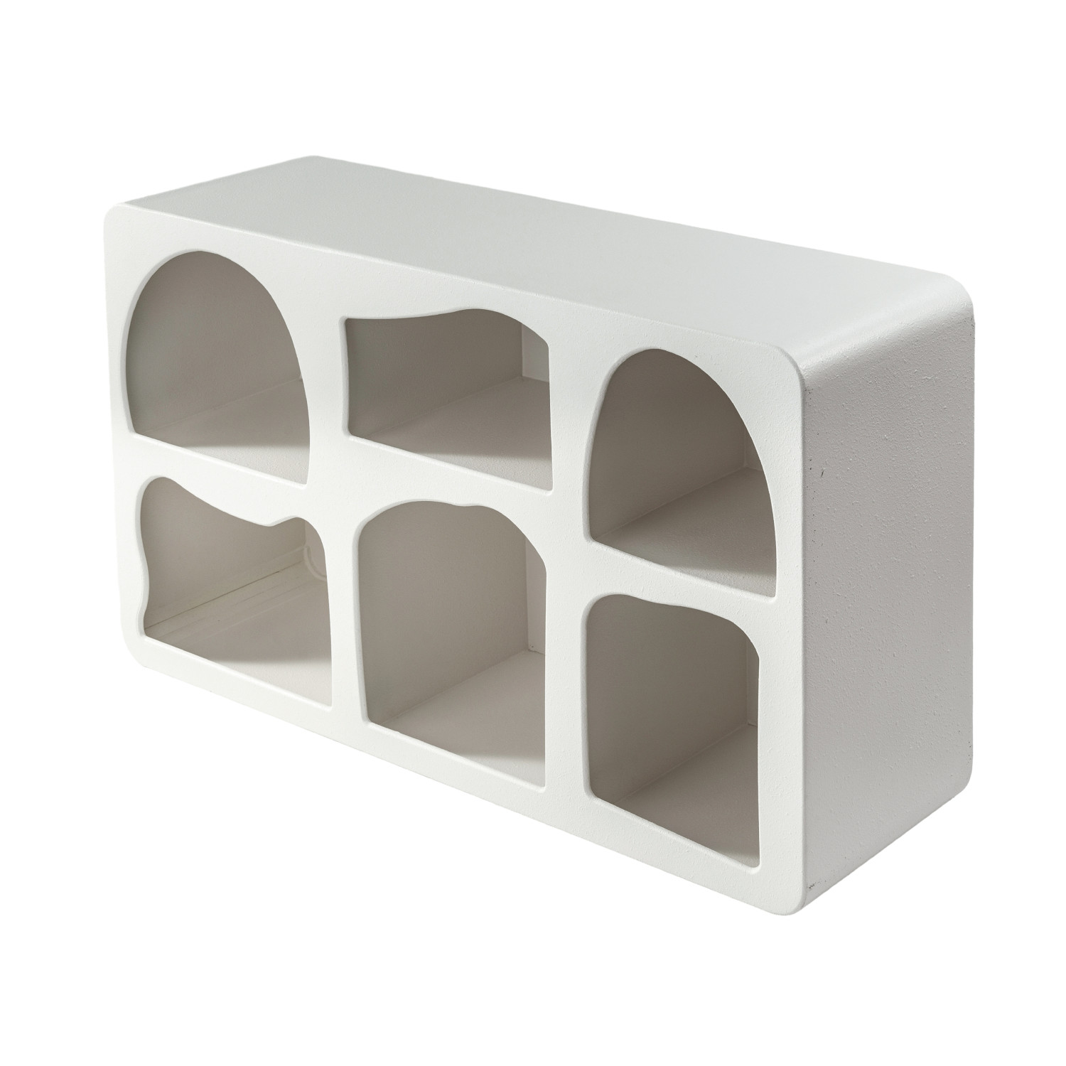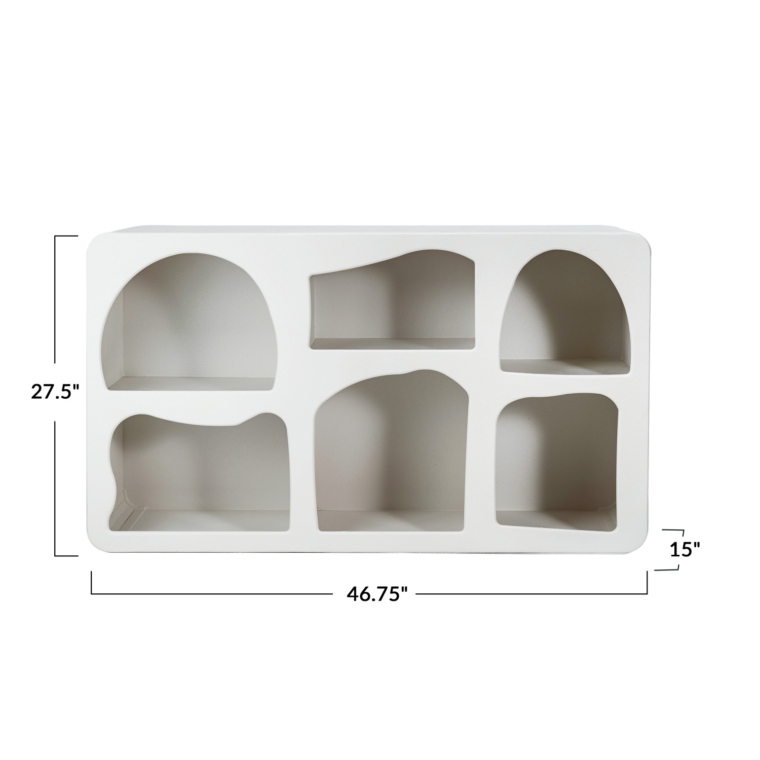 This Versatile Textured White Wood Shelf is a blend of style and practicality. Its six spacious compartments are perfect for displaying books, collectibles, or essentials, while the textured white finish adds a touch of sophistication to the decor. The shelf's dimensions, 46.75 inches long by 15 inches wide by 27.5 inches high, make it an ideal choice for any room, providing significant storage without overwhelming the space. Whether used in a living area, bedroom, or office, this shelf stands out for its versatility and elegant design, ready to be shipped directly to the door for immediate enhancement of the home.
