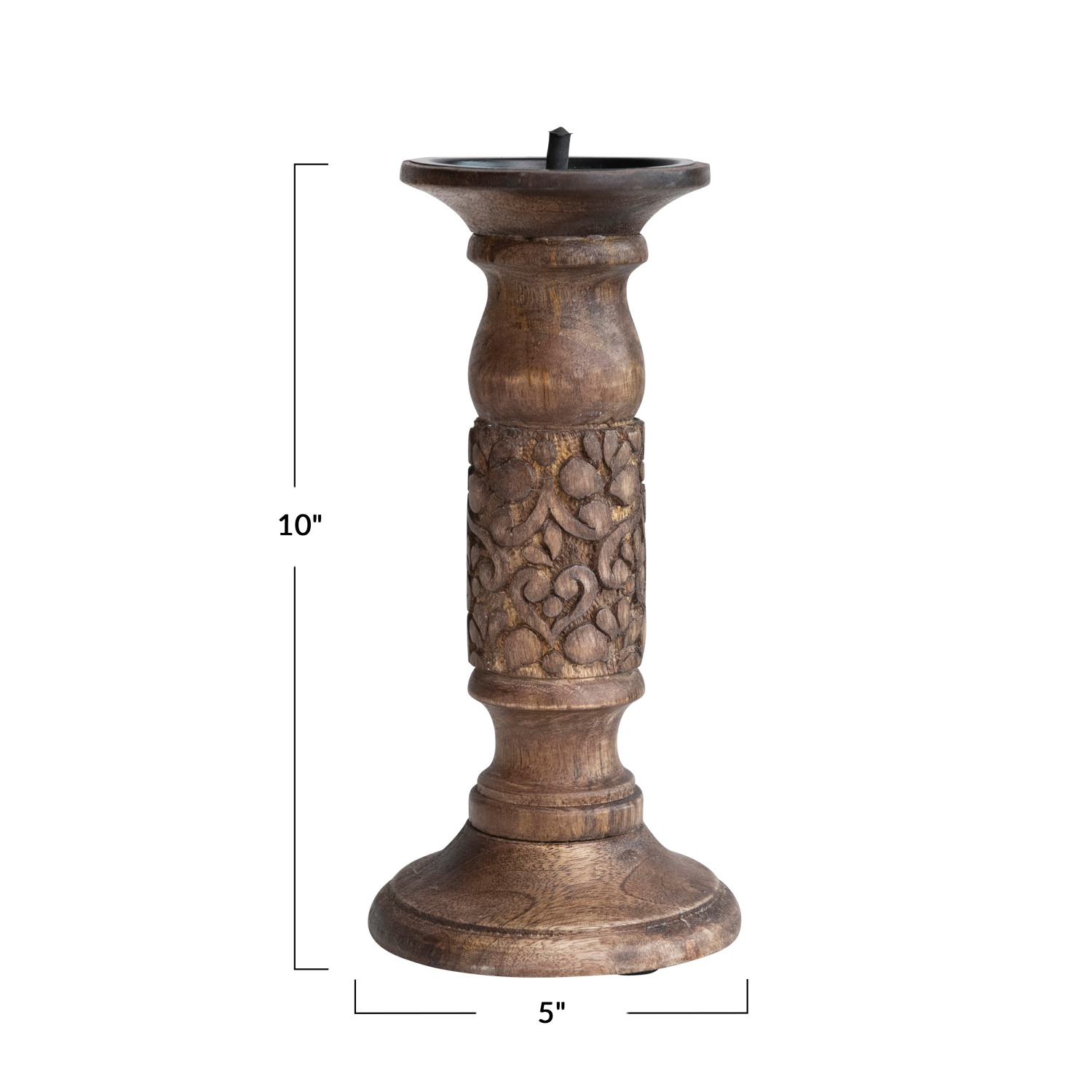 Catalog Name: 5" Round x 10"H Hand-Carved Mango Wood Candle Holder w/ Design, Walnut Finish (Holds 4" Pillar)