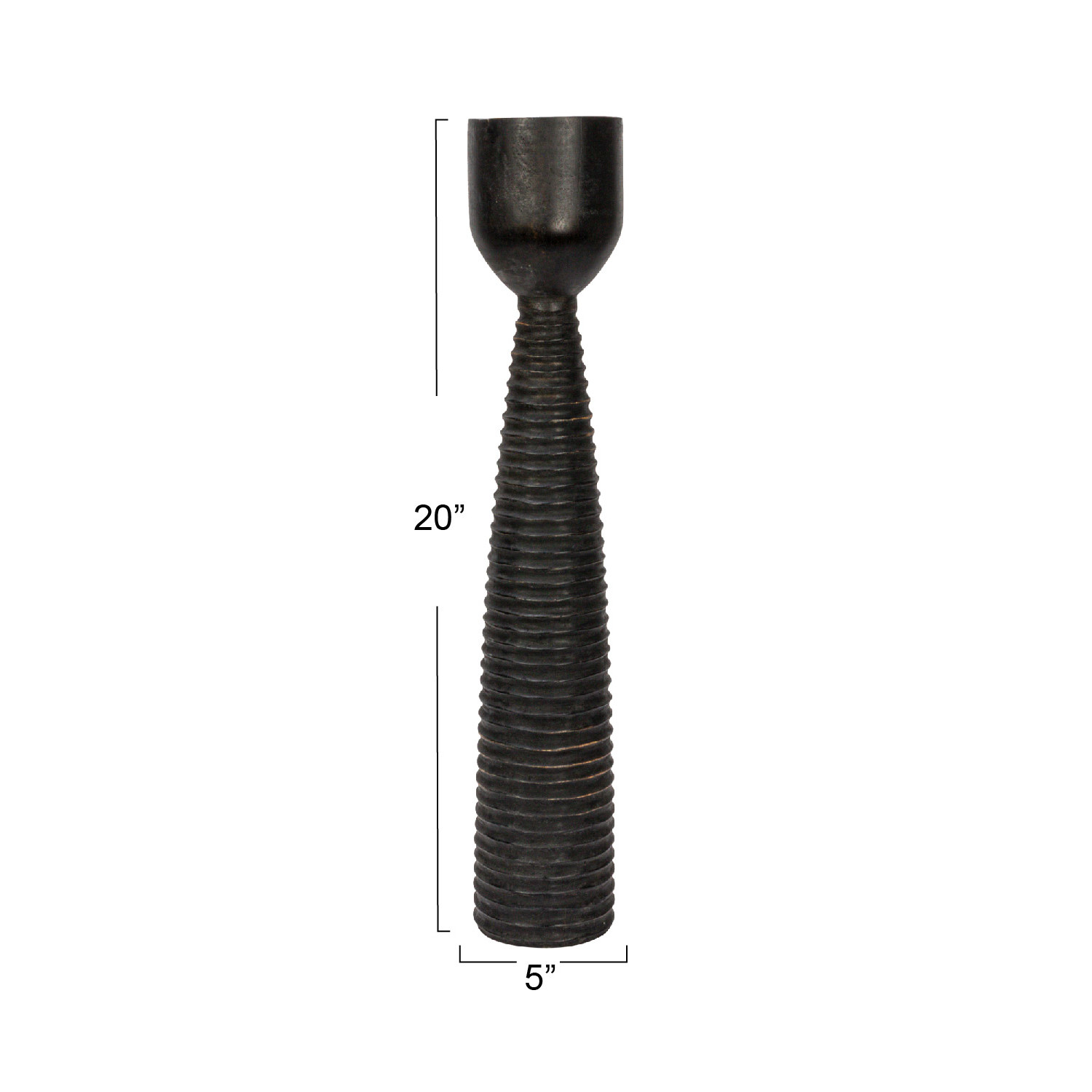 Illuminate the home with this black mango wood ribbed candle holder. This candle holder features a hand-carved mango wood construction that has a ribbed texture and a black finish. The mango wood material is pure and eco-friendly, as it comes from trees that are harvested after they stop producing fruit. The candle holder has a round base and a round top that can hold a 4-inch pillar candle (not included) creating a cozy and romantic atmosphere. It measures 5 inches in diameter and 20 inches in height. Whether used as a standalone piece or with a matching set, this candle holder will be a stunning accent for a table centerpiece, mantelpiece, or fireplace. A tall and slender candle holder with a hand-carved mango wood construction and a black finish. Suitable for any home decor style, especially rustic, dark, or timeless. Perfect for adding some height and elegance to a table centerpiece, a mantelpiece, or a fireplace. Made of pure mango wood.