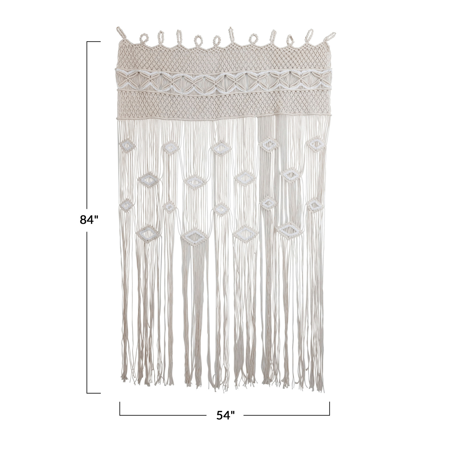 This boho-inspired curtain showcases intricate, cascading macramé cotton in various geometric designs. Hand-woven cotton blend macramé curtain in natural and white. Display as a stylish curtain alternative, doorway decoration, or woven wall hanging. Spot clean only.