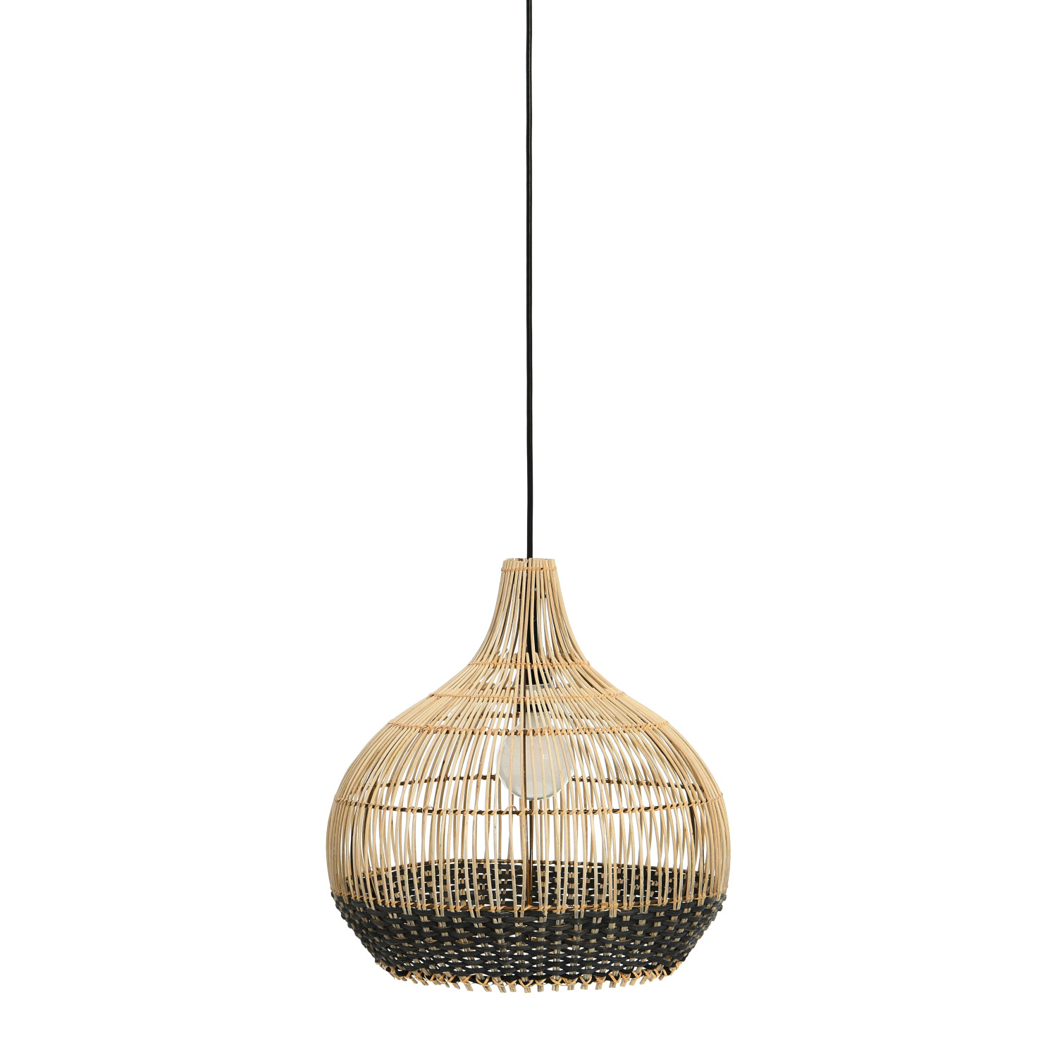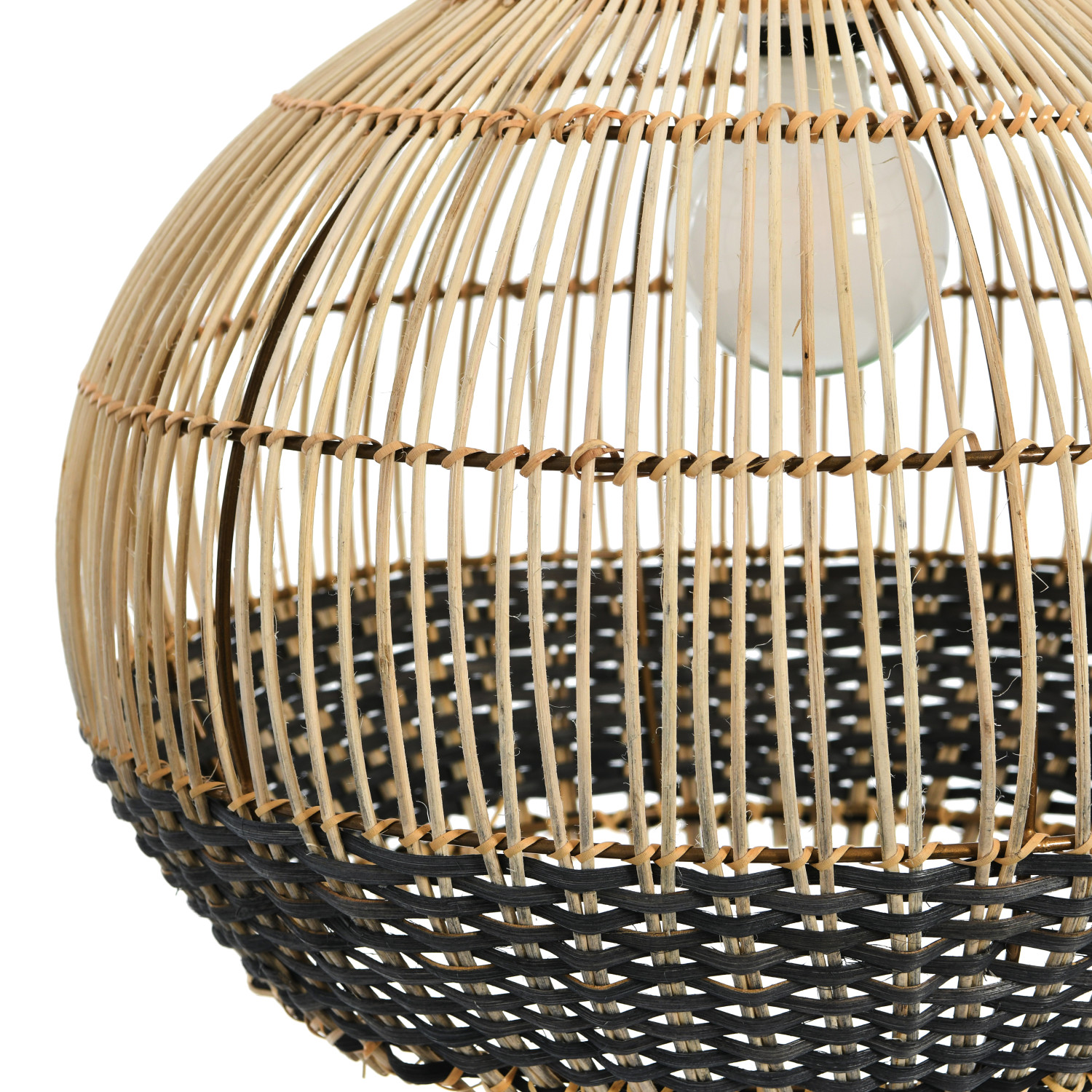 This boho-inspired ceiling light showcases a 2-tone shade crafted from intricately hand-woven cane. Cane and metal ceiling light in black and natural finish; 6' cord. Display this stunning light fixture to instantly elevate any bedroom or gathering space. Maximum 60-watt bulb (not included).