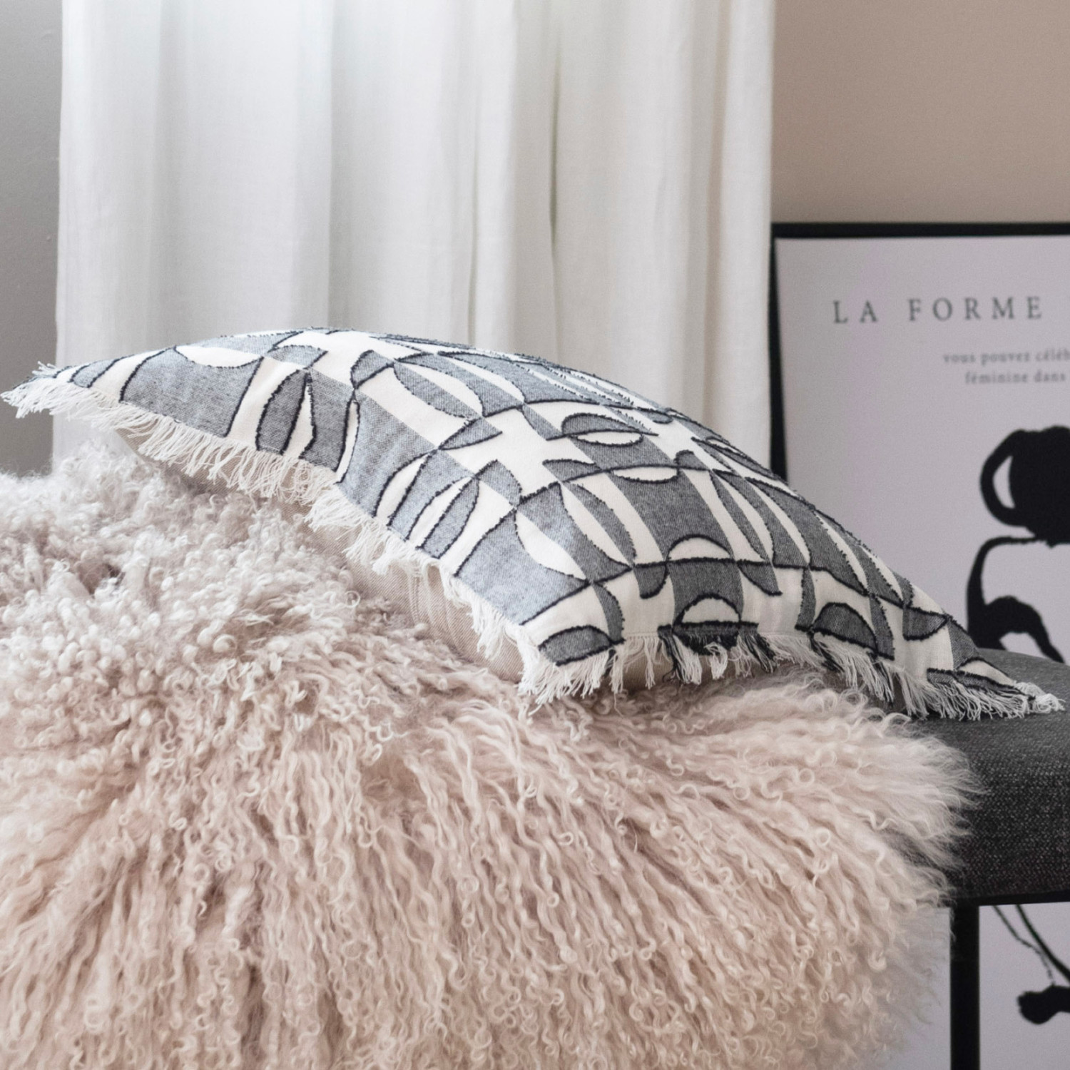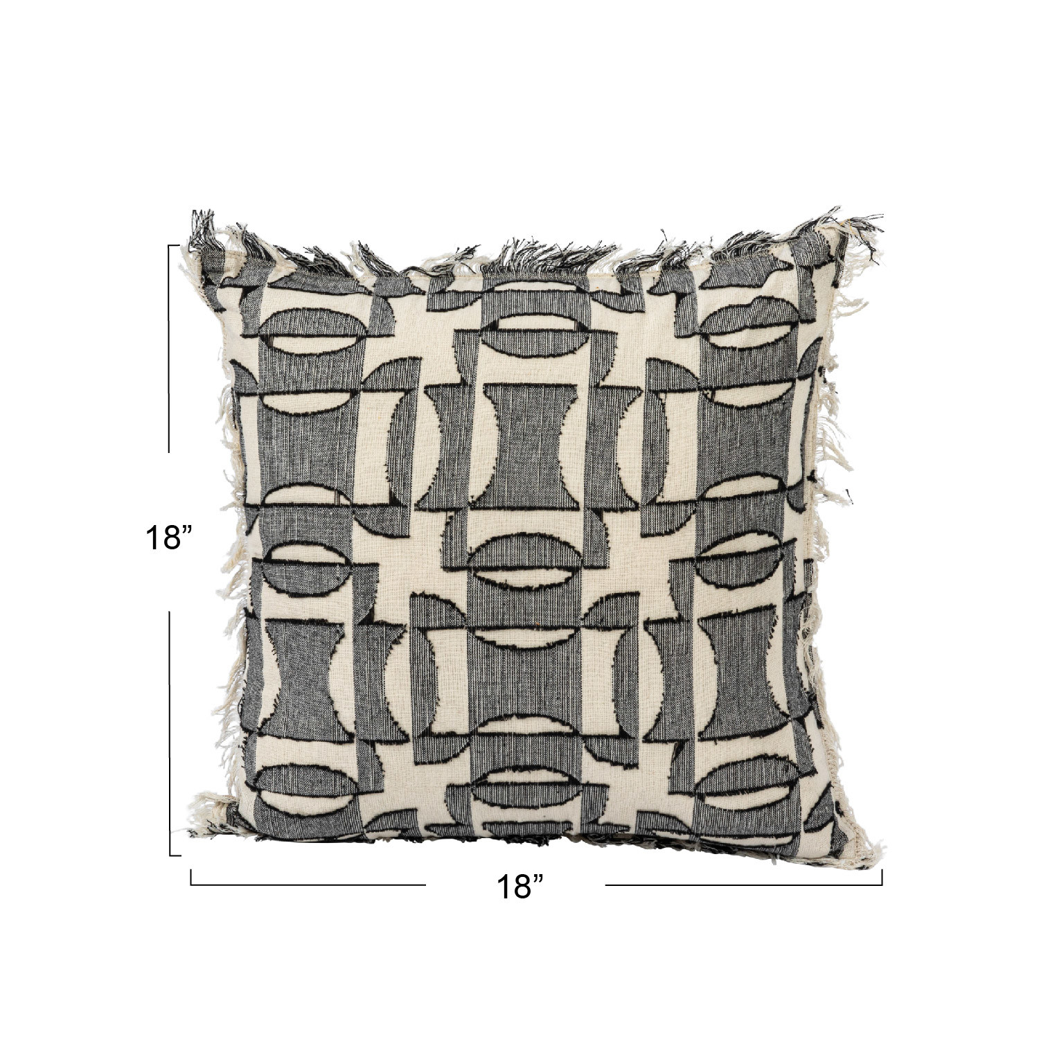 Add a touch of style and sophistication to every living space with this 18-inch square woven cotton pillow featuring a captivating geometric pattern in black, cream, and natural tones, creating a visually striking design. Use it as a cozy support while relaxing or reading, or simply as a decorative accent to elevate the overall aesthetic of any home; its versatile color palette and geometric pattern make it suitable for various interior design styles. The front of the pillow is made from 100% cotton, offering a soft and comfortable texture filled with 100% polyester, providing a plush and supportive feel. This product is made of cotton and polyester filler. This pillow measures 18 inches in length and 18 inches in width.