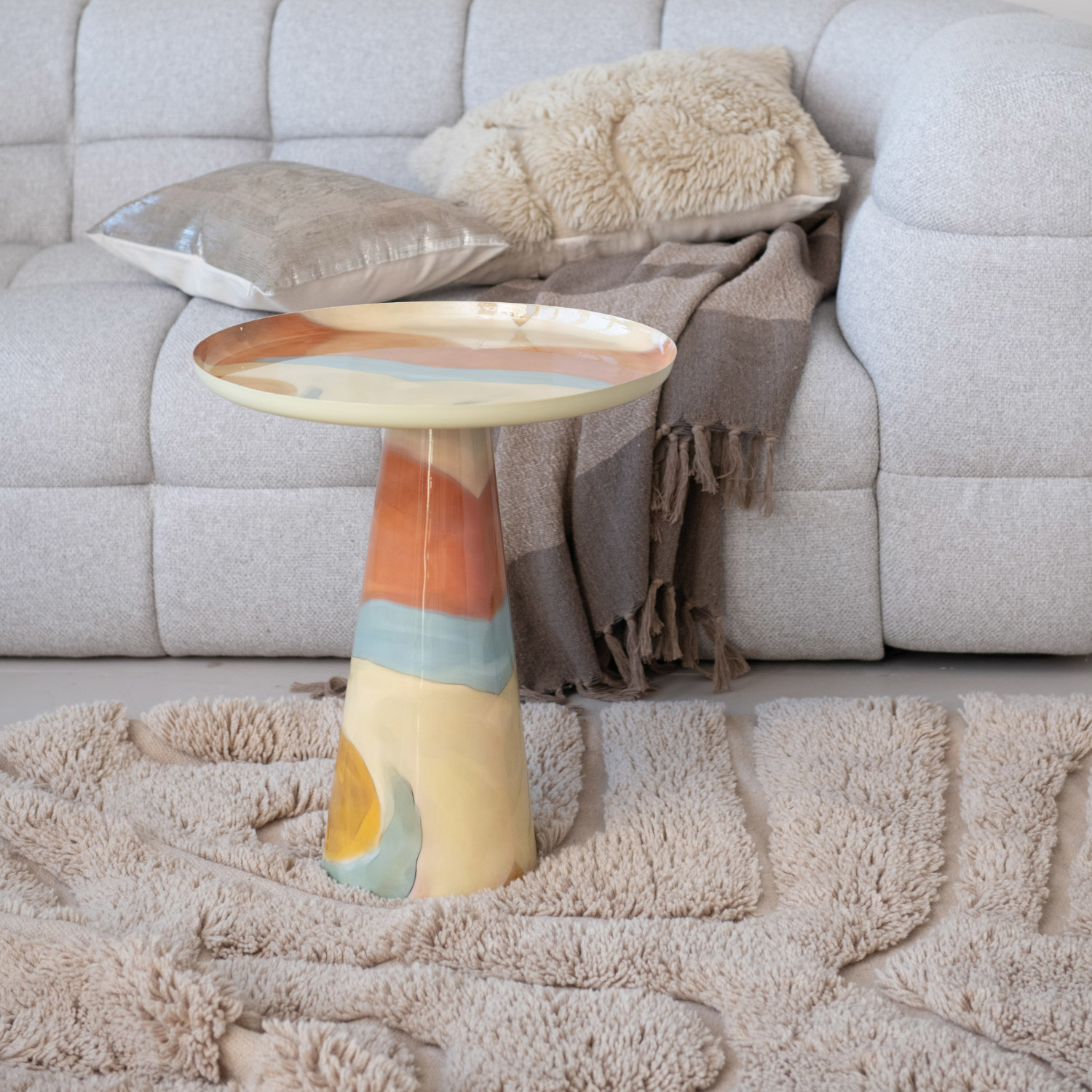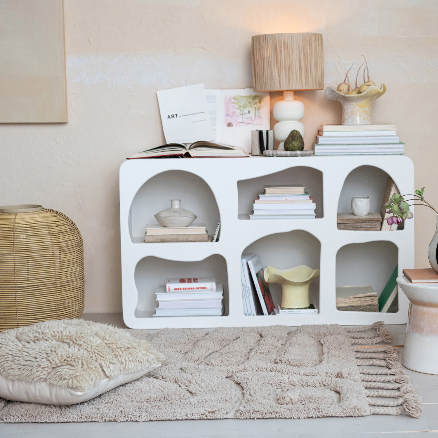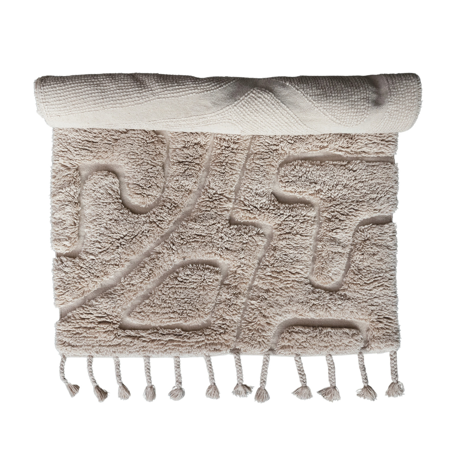 This Tactile Elegance Hand-Woven Rug is a masterpiece of craftsmanship and design. Measuring a generous 71 by 47 inches, it features a plush 1-inch pile height and 6-inch long braided tassels that add a playful touch to its edges. The natural hues of the wool and cotton blend weave a story of comfort and style. Experience the rug's softness underfoot while relaxing in any living space. Its organic shape and varying pile heights create a dynamic visual and tactile experience, making it a focal point in any room. Designed for those who appreciate the finer details, this rug is a testament to the beauty of handcrafted artistry.