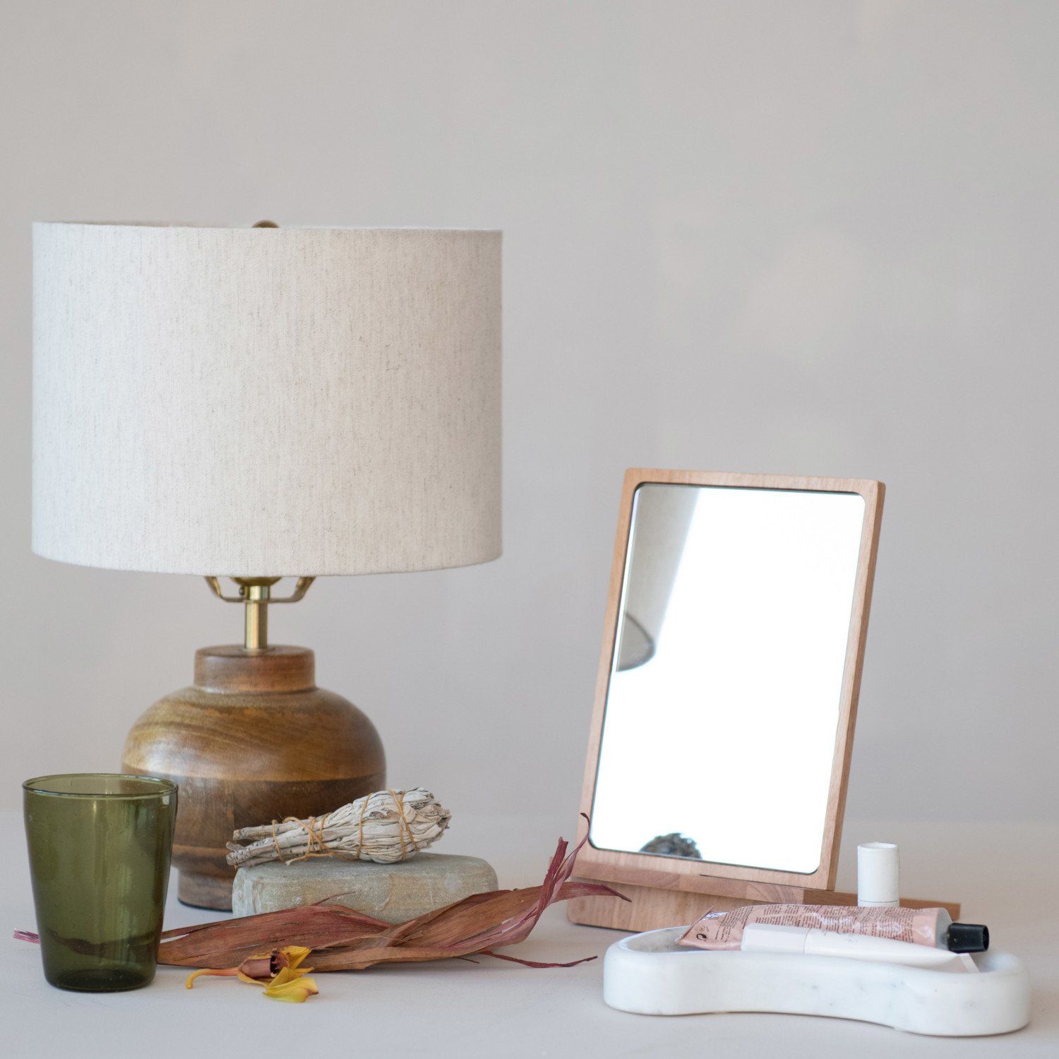 This Rubberwood Interlocking Dresser and Desk Mirror is a statement of simplicity and utility. Its interlocking design and wood stand, all in a pleasing natural tone, bring a sense of serenity to any room. The mirror measures 6.75 inches long, 6.25 inches wide, and 9.75 inches high, offering a substantial view that's perfect for a quick glance before a meeting or a detailed look while getting ready. Its rubberwood construction ensures durability, while the natural finish highlights the wood's inherent beauty, making it a timeless addition to any space. Whether placed on a dresser for accessorizing or on a desk for a last-minute appearance check, this mirror stands as a testament to tasteful functionality.